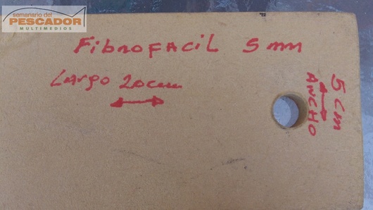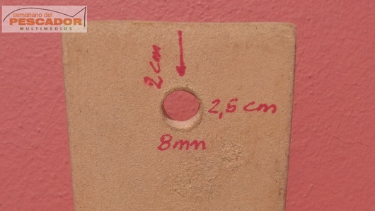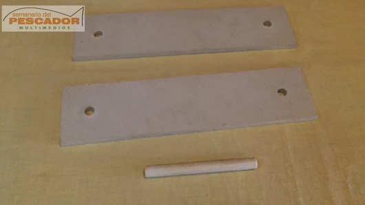 A nuestras tablitas de fibrofacil le aremos dos perforaciones con una mecha de ocho milímetros, las que van a ir a 2 centímetros de cada extremo y a 2,5 centímetros de cada lateral. En estas perforaciones colocaremos los tarugos hasta que hagan tope al pasar al otro extremo. Si les parece necesario se puede poner una gota de algún buen pegamento en cada punta del tarugo y listo para usar.